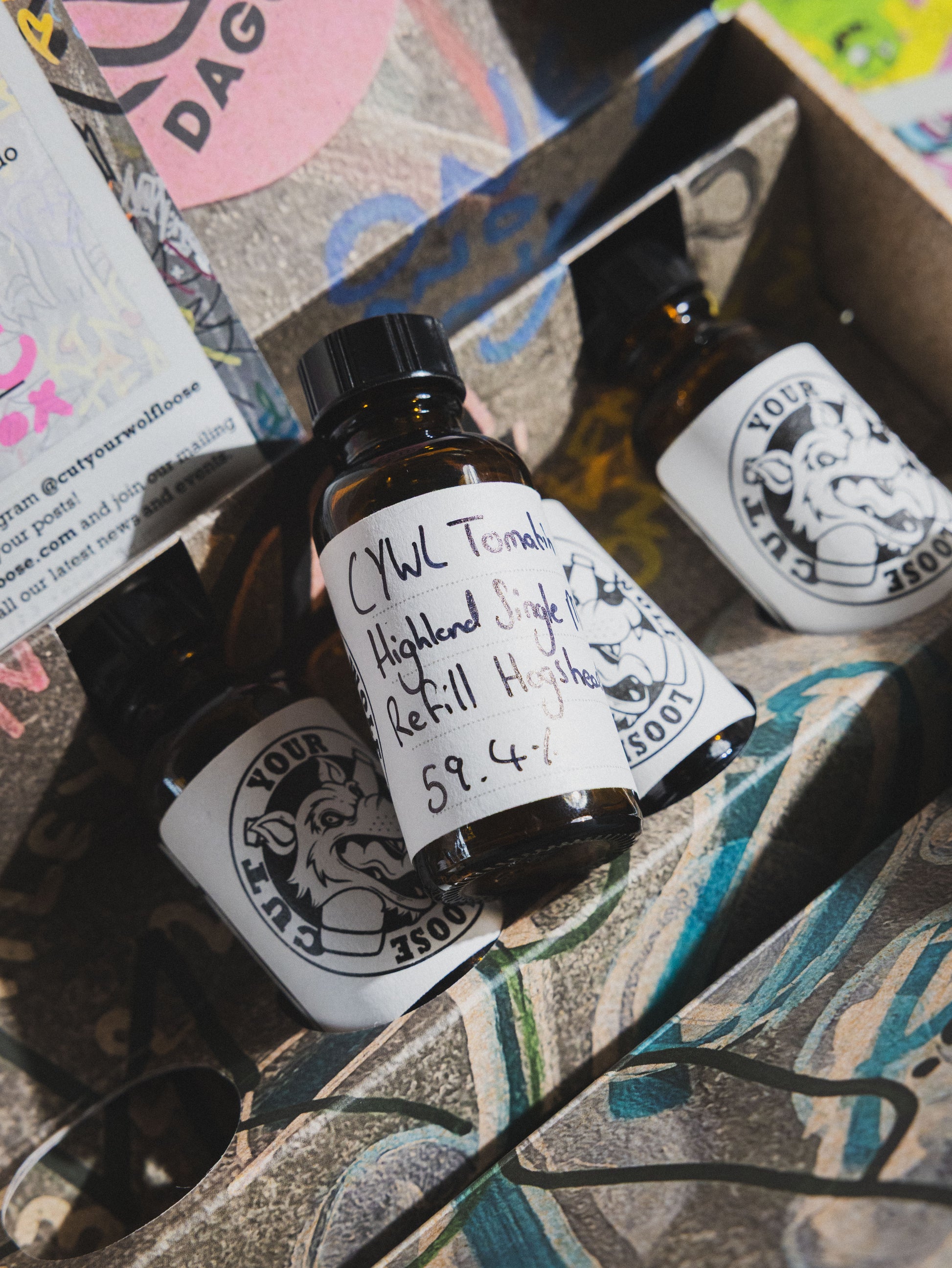 A beautifully presented selection of 25ml bottles, with hand written labels, comprised of the following of our releases :