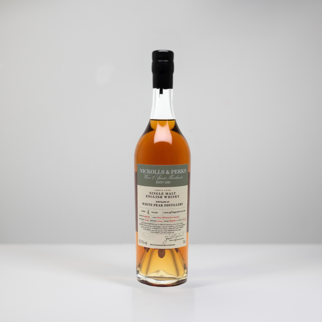 The first ever single cask Madeira expression from the White Peak Distillery, bottled for the 2024 Nickolls & Perks outturn of own label spirits. The White Peak Distillery operates in a 19th-century ex-Wire Works, now a UNESCO World Heritage site. Crafted solely from English barley and fermented using live yeast from a famed local brewery, their multi-award-winning whiskies are characterful, robust and lightly peated. The Madeira wine cask in which this release was matured spent its final months of maturation in the upper levels of the White Peak Distillery's warehouse, where the warmer conditions led to a fuller and more pronounced flavour profile. Bottled at the natural cask strength without added colouring or chill filtration. Just 299 bottles were yielded in this single cask expression.